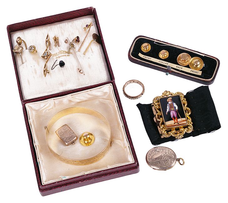 including a Victorian cuff bracelet with large enamelled porcelain scroll mounted gilt metal clasp, a selection of stick pins including 15ct and 9ct gold, an Edwardian 9ct gold bar brooch, another brooch, tests for gold, 9ct gold studs, two picture lockets (Q)