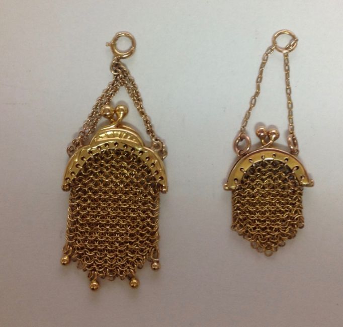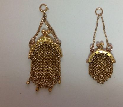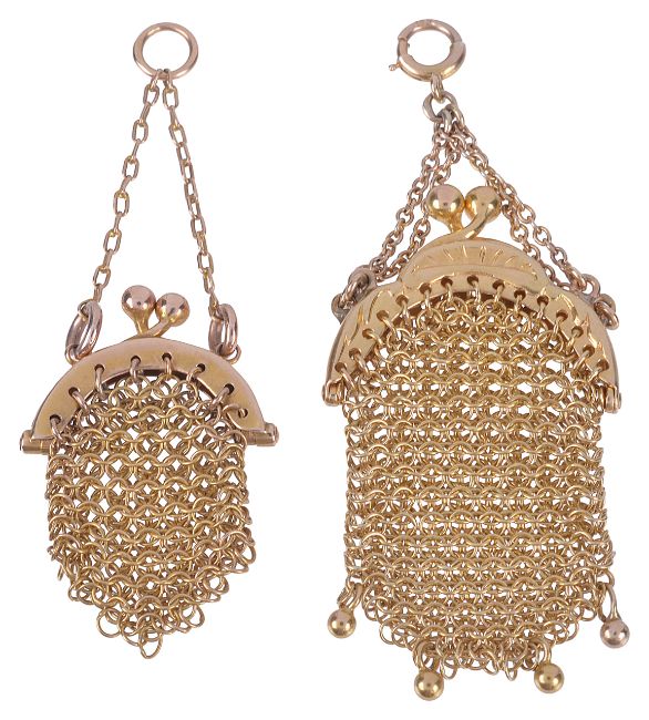 A charming Edwardian 18ct gold miniature mesh evening bag pendant, charm having shaped hinged frame and chain handle and with fine bead detail to the lower edge, sold together with a similar smaller 'working' miniature mesh evening purse, tests for gold, a delightful lot (2) gross weight approx. 8.3 gm., approx size larger 50 x 21 mm., smaller but measured without chain approx. 25 x 19 mm Condition:Fair to good, with wear to exterior, no apparent holes in mesh