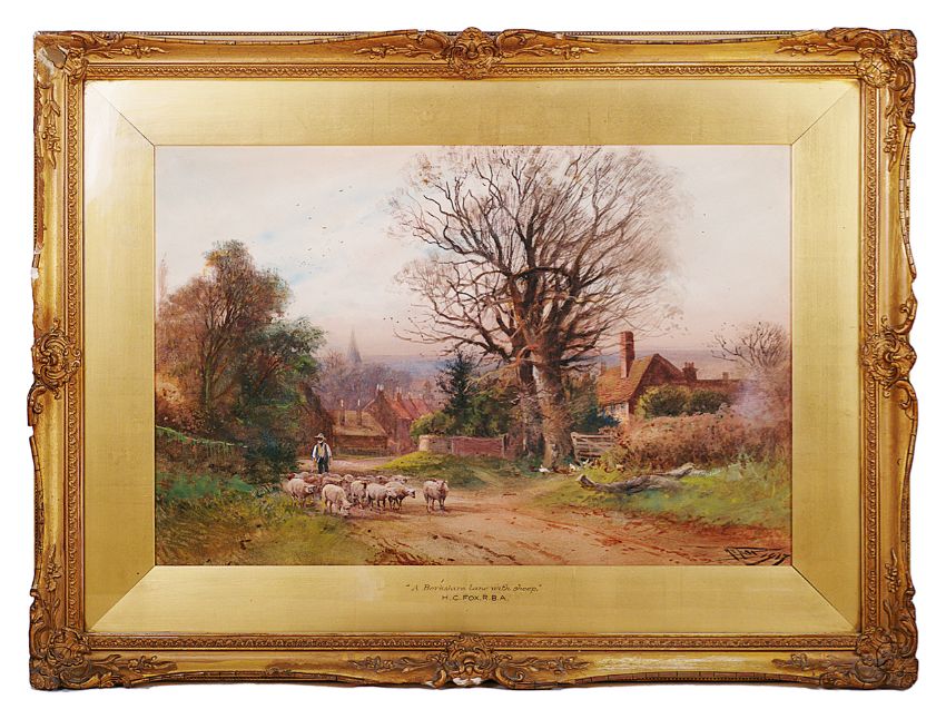 'A Berkshire lane with sheep', signed lower right HC Fox dated 1913, in a gilt mount titled, in a gilt frame