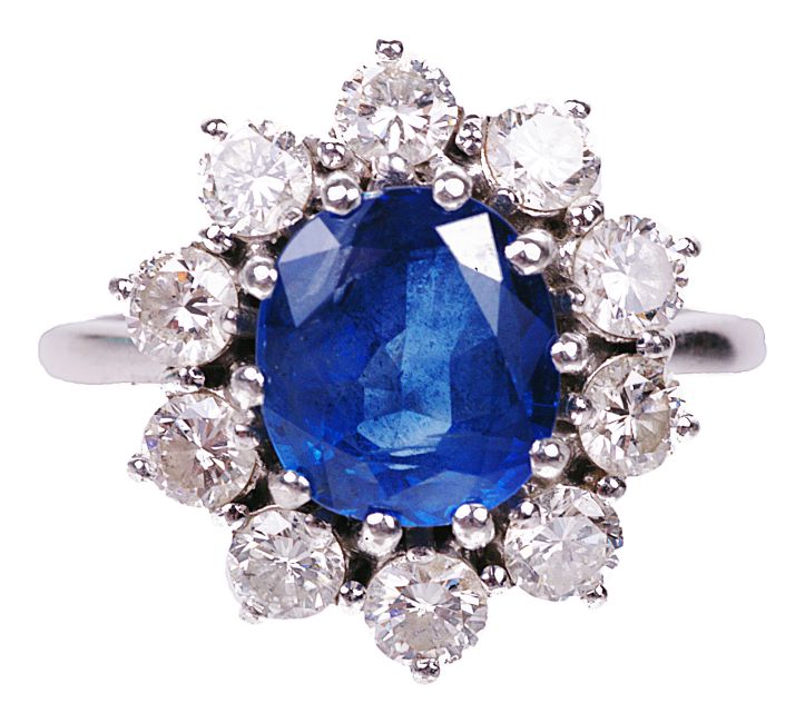 the oval sapphire set within a border of ten circular brilliant cut diamonds, white metal mount