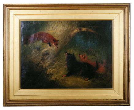 'Terriers facing a fox' oil on canvas, signed lower left, gilt frame