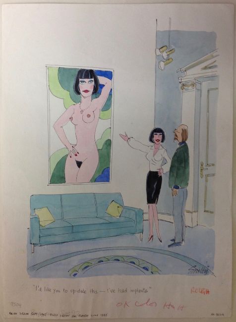Unpublished cartoon artwork for Playboy, drawn: June 1995, pen and ink with watercolour, on Daler board, signed lower right, caption below, Copyright Playboy Publications All Rights Reserved & Not For Reproduction stamps on lower margin, Smilby yellow dot verso, with dust sheet, together with artists rough workup for this artwork with artists notes in margins, signed lower right and ‘Ok Color HmH’ on lower margin in red crayon possibly by Hugh Hefner, (2)