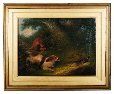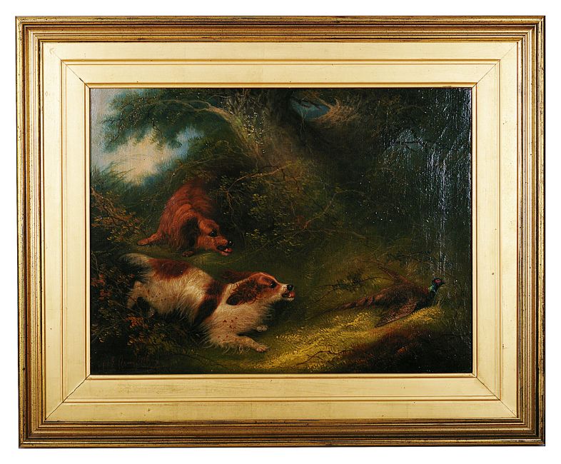 'Terriers chasing a pheasant' oil on canvas, signed lower left, gilt frame