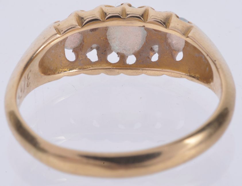 having central oval opal of good colour between two smaller matching opals and with diamond point detail, mount marked for 18ct gold