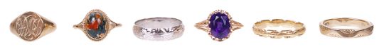 A collection of six various 18ct and 9ct gold rings.