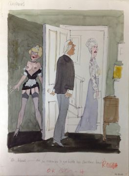 cartoon artwork for Playboy Dec 1982 pg.287, drawn: Jul 1982, pen and ink with watercolour, on Arne board, signed lower right, artists notes in margins, caption below, Copyright Playboy All Rights Reserved stamp & Playboy Publications Inc Reproduction Prohibited Without Permission lower margin & verso, Smilby yellow dot verso, with cellophane sheet, together with artists rough workup for this artwork with artists notes in margins, unsigned, ‘Ok Color – H’ in red crayon possibly by Hugh Hefner, (2)