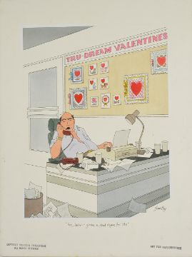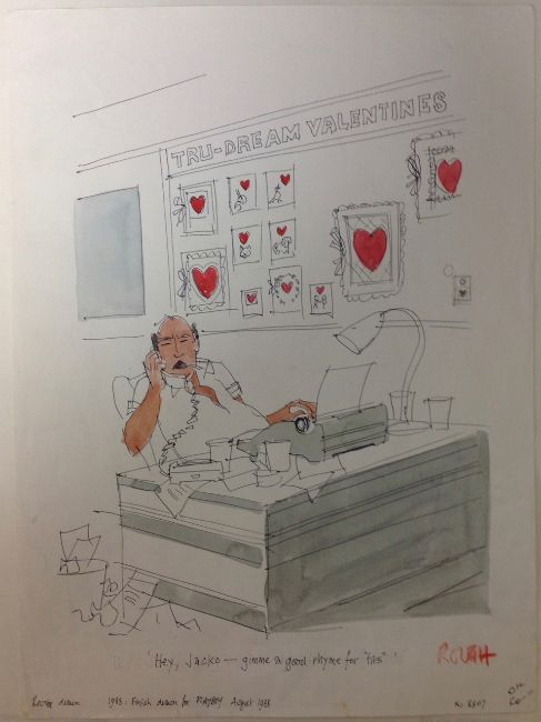 cartoon artwork for Playboy, pub. Feb 1989 p.125, drawn: Sept 1988, pen and ink with watercolour, on Daler board, signed lower right, caption below, Copyright Playboy Publications All Rights Reserved & Not For Reproduction stamps lower margin, Smilby yellow dot verso, with dust sheet, together with artists rough workup for this artwork with artists notes in margins, unsigned, (2)