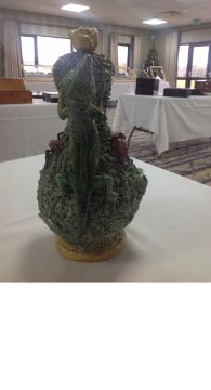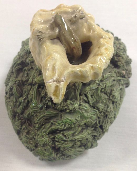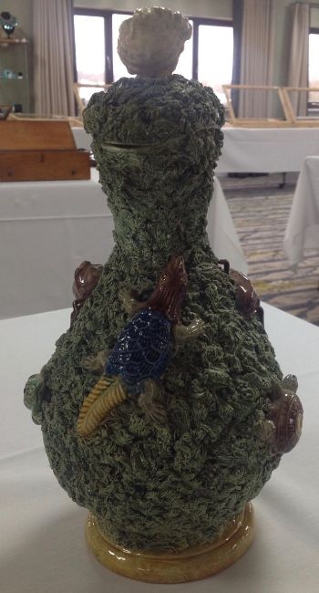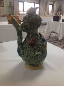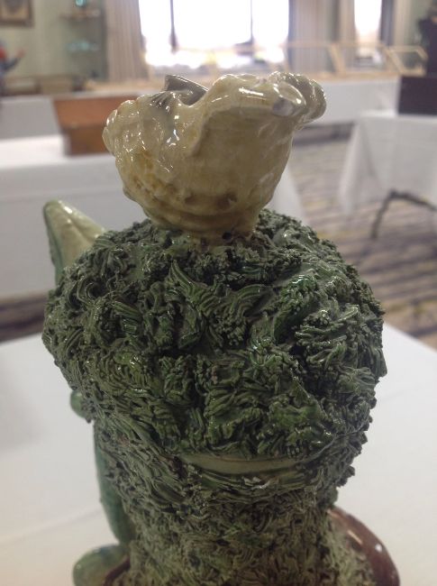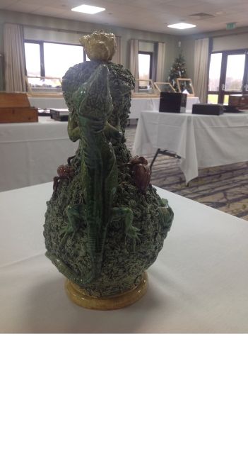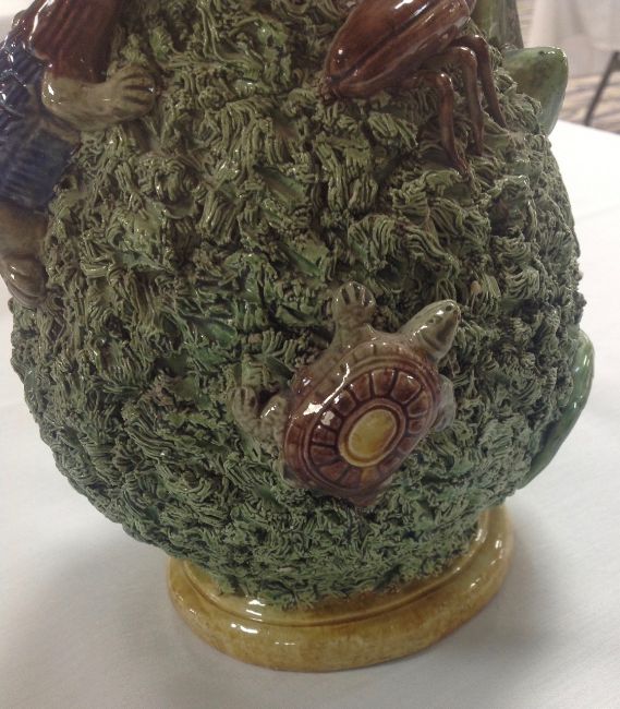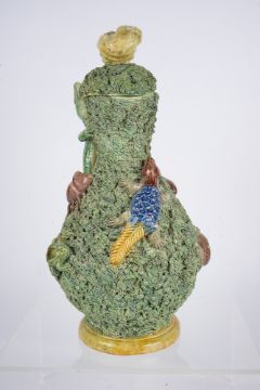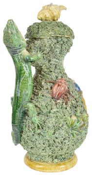 with applied frog, tortoise, lizard and other insects, on mossy ground, with handle in the form of a lizard, the lid mounted with shell with insect crawling out, a/f