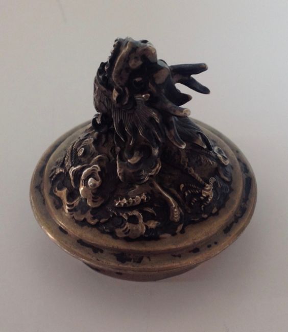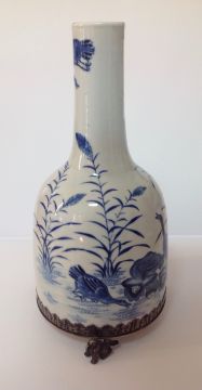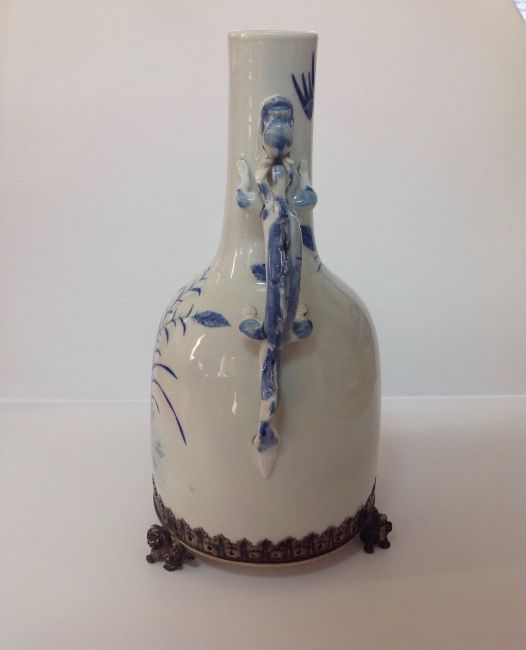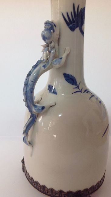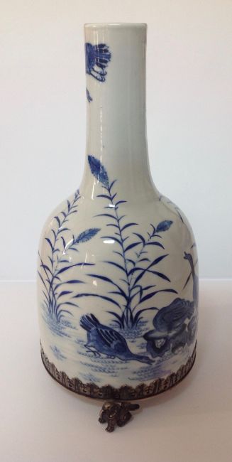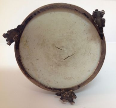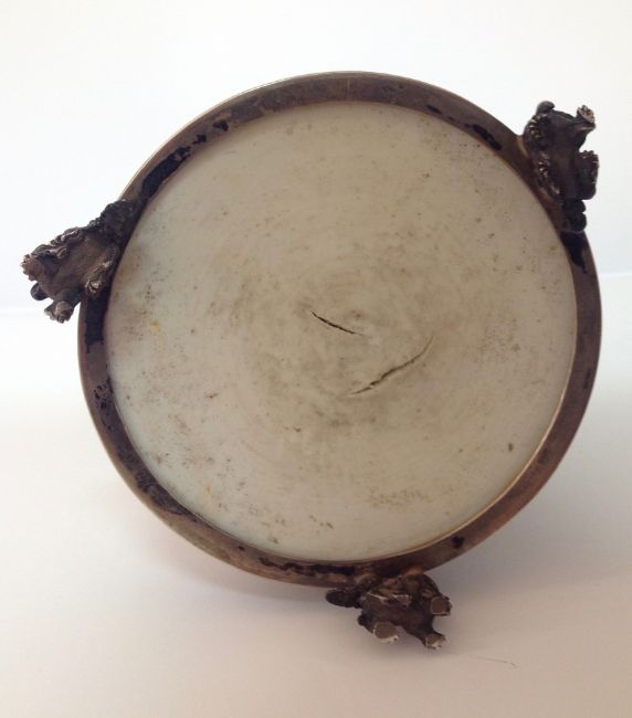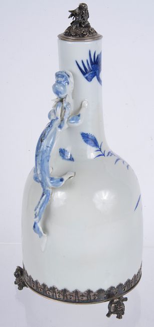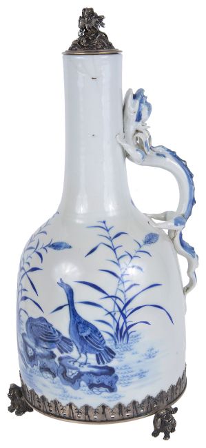 having fitted Chinese silver base supported on three lion dog feet and silver dragon head stopper, the body painted with geese upon rocks amid reeds, with impressed mark to silver