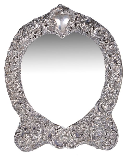 the pierced and embossed surround of acanthus leaves, cherubs and musicians, with a blank cartouche to the upper section, possibly by William Comyns.