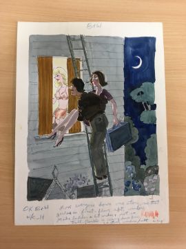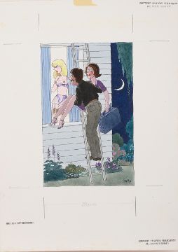 uncaptioned cartoon artwork for Playboy Jul. 1986 pg.155, drawn: Jul. 1981, pen and ink with watercolour, on Daler board, signed right, uncaptioned, Copyright Playboy All Rights Reserved stamp & Playboy Publications Inc. Reproduction Prohibited Without Permission upper, lower margins & verso, Smilby yellow dot verso, with dust sheet, together with artists rough workup for this artwork with artists notes in margins, signed lower right, ‘Ok B & W W/C – H and further notes’ in blue crayon possibly by Hugh Hefner, (2).