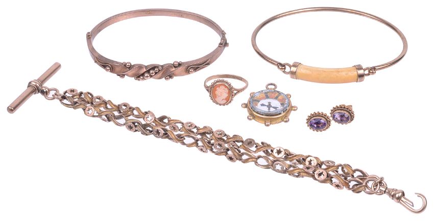 comprising a Victorian fancy link 9ct gold watch Albert with gold mounted compass 'ships wheel' fob, a 9ct gold Victorian hollow rose coloured bangle,a later 9ct gold modernist bone set bangle, a pair of modern amethyst earrings and a 9ct gold mounted cameo ring (Q)