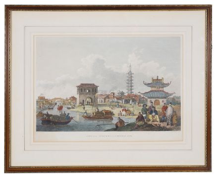 William Alexander 'View of the suburbs of a Chinese city'a coloured engraving, published April 12th 1796 by G. Nicol, mounted and framed33 x 46cmCondition: In good overall condition with clear colour. No tears or obvious damage. Unexamined out of frame.William Alexander (1767-1816) a student at the RA, accompanied Lord Macartney's embassy to China for two years recording the journey as he travelled producing over 2000 sketches and subsequently a number of watercolours. In some of the watercolurs he depicts himself in the background sketching.It is believed that the interior of the Royal Pavilion in Brighton was influenced by William Alexander, although he never visited it!!
