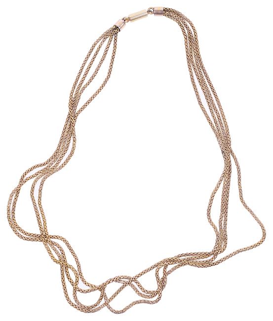 An Edwardian delicate four row yellow metal fine chain necklace,