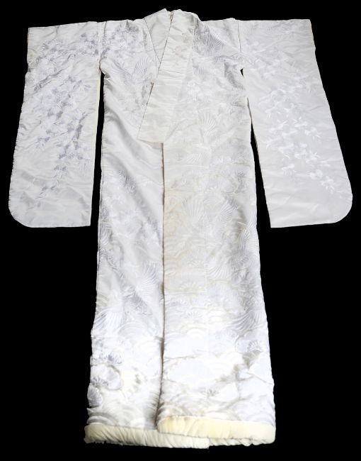 the kimono embroidered in self coloured threads with herons in flight amongst cloud scrolls and mixed blossoms, padding to hem