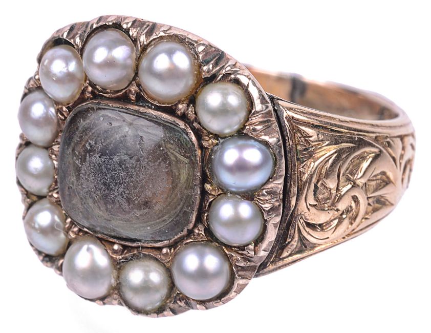 having central hair locket within a half pearl set border and with scroll engraved mount, the interior with two memorial inscriptions one dated 1816 the other 1817