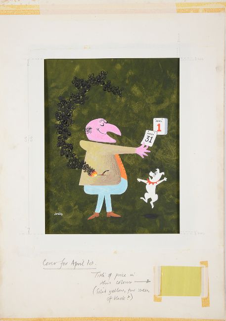 original cover artwork for Punch magazine 1st April 1959, pen and ink with watercolour, on Saunders board, signed lower left, artists notes in margins on applied border, uncaptioned.