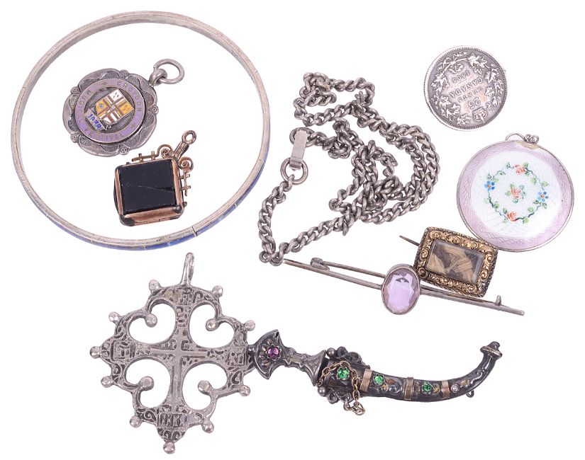 to include a 'jewelled' white and yellow metal 'Eastern dagger' brooch, tests gold and silver, a circular guilloche enamel silver pendant a.f., enamel and silver pendant fob, an amethyst and silver bar brooch, a silver and lapis bangle and four other items (Q)