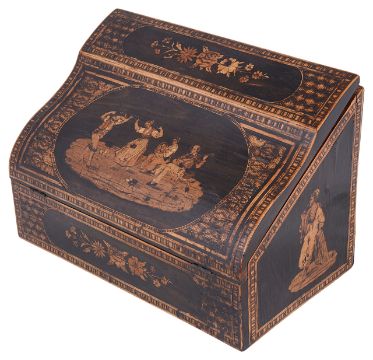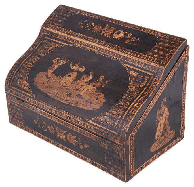 the sloped box inlaid and decorated with central vignette enclosing musicians and dancing couples, the sides decorated with a maiden carrying a water urn and a gentleman smoking a pipe, the green velvet lined writing slope interior with four sectioned letter compartments.