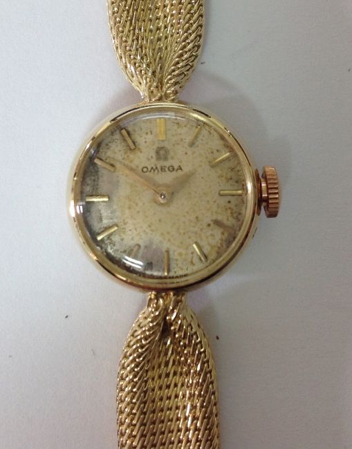 the circular champagne coloured dial with baton hours and dauphine hands, Omega logo on dial, with a mesh bracelet and Omega buckle, buckle hallmarks 585.