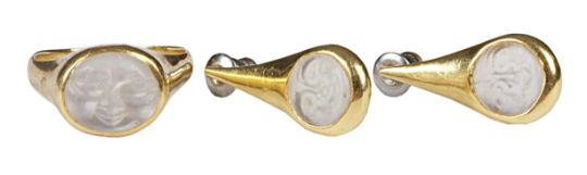 the yellow metal ring, tests for gold and set with an oval moonstone carved with the face of a smiling moon, the earrings similar and of drop form, each set with a smaller circular carved moonstone 'smiling moon' face, the earrings stamped to reverse with a cursive S