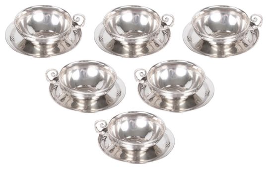 of squat circular form with ribbon and ribbed decorated body and scroll handles, the circular saucers with similar decoration, each hallmarked 800 with letter E, (12).
