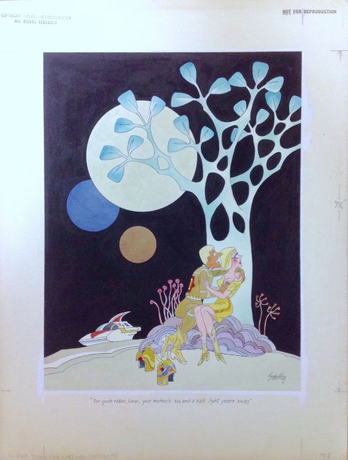 cartoon artwork for Playboy June 1985 p.g 189, drawn: August 1983, pen and ink with watercolour, on Daler board, signed lower right, caption below, Copyright Playboy All Rights Reserved stamp & Playboy Publications Inc. Reproduction Prohibited Without Permission upper margin and verso, Smilby yellow dot verso, with cellophane sheet, together with artists rough workup for this artwork with artists notes in margins, signed lower right, 'Ok Color - H' in red crayon possibly by Hugh Hefner, (2).