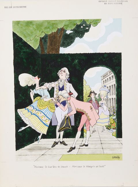 cartoon artwork for Playboy Cartoon Paperback book 1990, drawn: Mar 1972, pen and ink with watercolour, on Arne board, signed lower right, artist’s notes lower margin, caption below, Copyright Playboy All Rights Reserved stamp & Playboy Publications Inc. Reproduction Prohibited Without Permission upper margin & verso, Smilby yellow dot verso, with dust sheet.