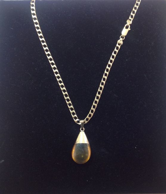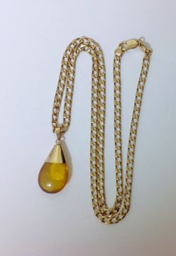A contemporary amber tear drop pendant on fancy 9ct gold chain