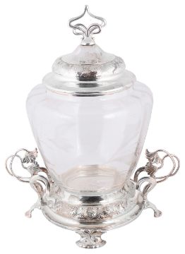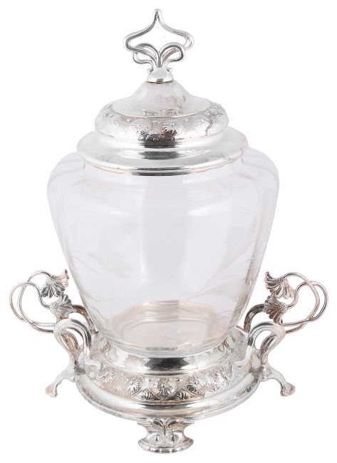 the silver plated lid with a band of flowerheads and a handle of tendrils, above a clear glass bowl etched with flowers, the base with a band of flowerheads raised upon four supports, the silver plated handles in the form of tendrils and flowers as handles, factory stamp to base.