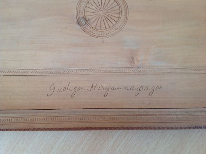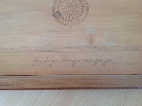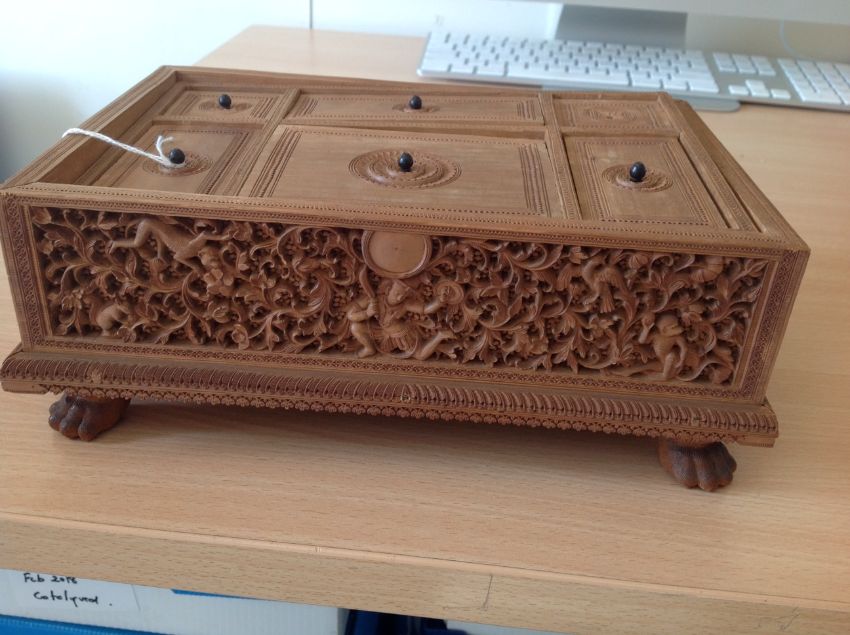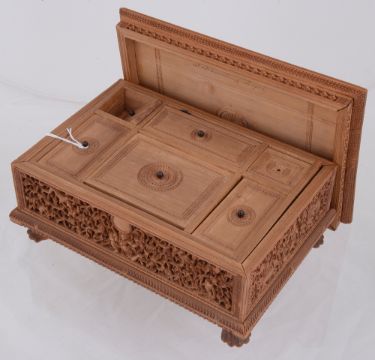 A 19th century Anglo-Indian carved sandalwood casket car?ved by Guoligar Hiryirmaigagar (?)