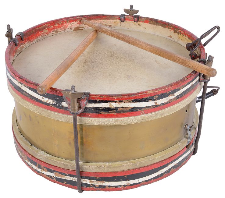 the drum having brass shell wooden counterhoops, skin heads, four brass and iron wing-nut rod tension screws and steel hook carry attachment, with drum sticks, a/f, (3).