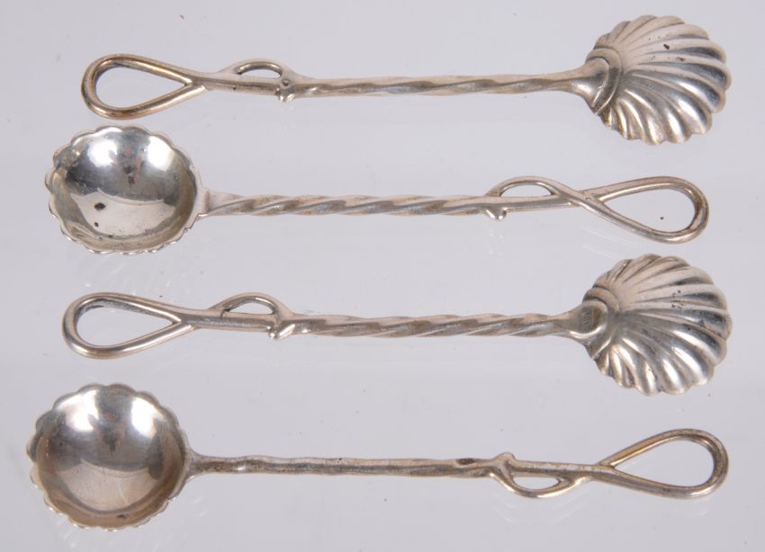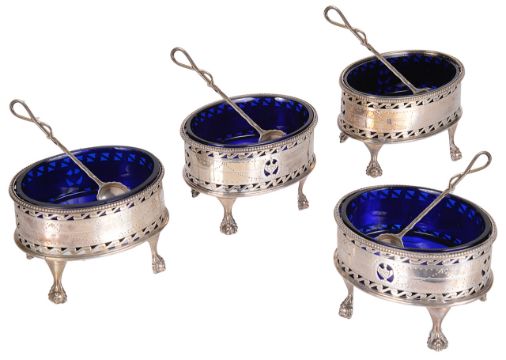 of navette form with pierced and bright cut engraved bodies with beaded rim upon four ball and claw supports, with blue glass liners, each hallmarked, by James Waters, together with four silver plated salt spoons, (8).
