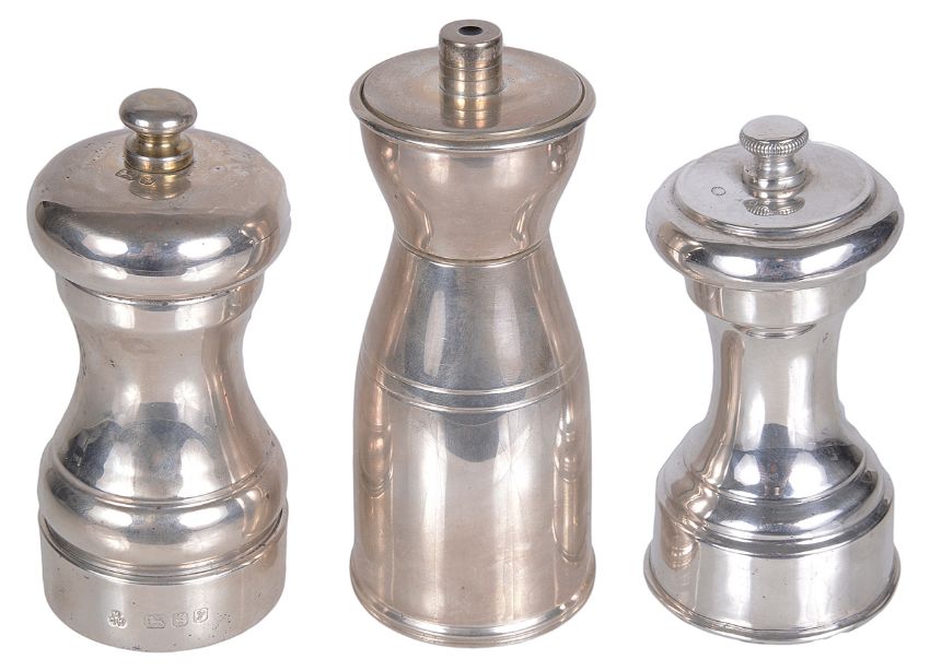 Three contemporary silver pepper/salt mills, hallmarked London 1989 & 2000, Birmingham 1918