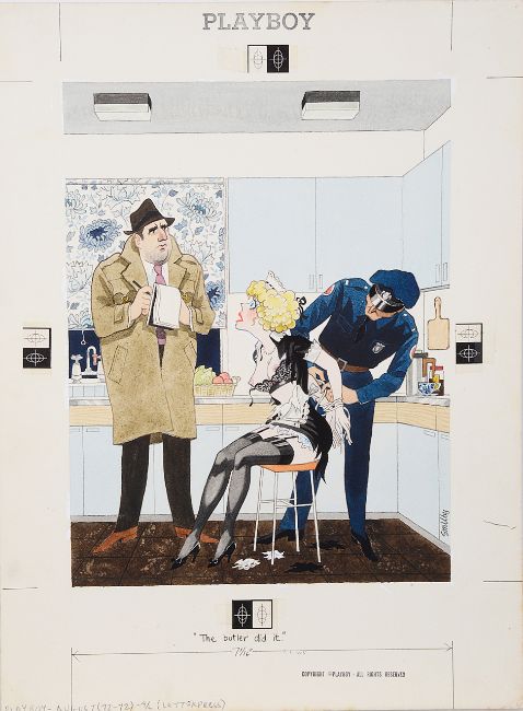 cartoon artwork for Playboy Aug. 1972 pg.203, drawn: Mar 1972, pen and ink with watercolour, on Arne board, signed lower right, artists notes in margins, caption below, Copyright Playboy All Rights Reserved stamp & Playboy Publications Inc. Reproduction Prohibited Without Permission upper, lower margins & verso, stickers applied to board, Smilby yellow dot verso, with dust sheet.