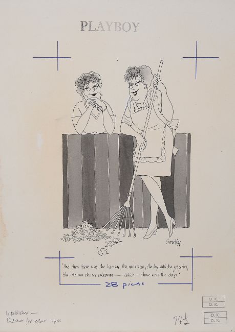 cartoon artwork for Playboy, pen and ink with watercolour, on Milburn board, signed lower left, artists notes in margins, caption below, Copyright Playboy All Rights Reserved stamp & Playboy Publications Inc. Reproduction Prohibited Without Permission in margins, with dust sheet.