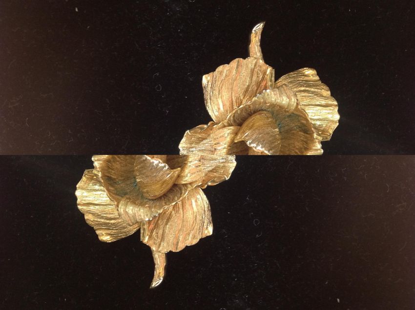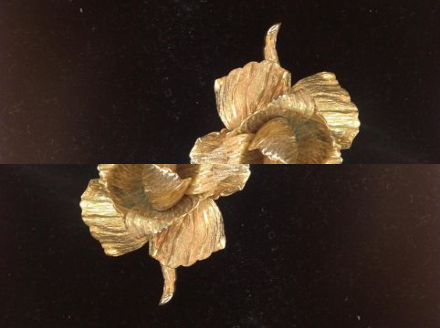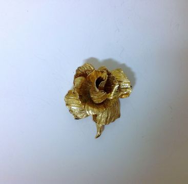 the brooch gold tone and formed as a large rose in bloom, oval disc to reverse stamped Christian Dior Germany 1969 and copyright circle