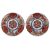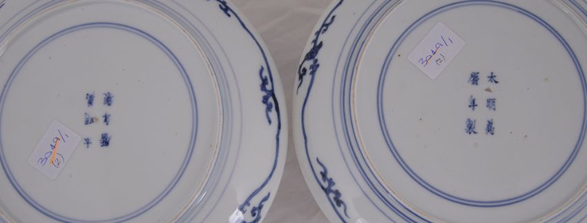 each decorated with three floral border cartouches in iron red and blue with gilt highlights, circular hatched border surrounding a central floral motif six character marks to base, a/f, (2).