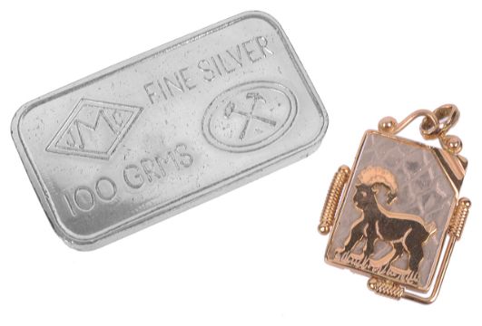 pendant approx. weight 8.4 gm., ingot 100 gm.