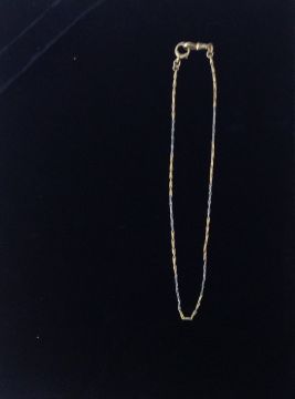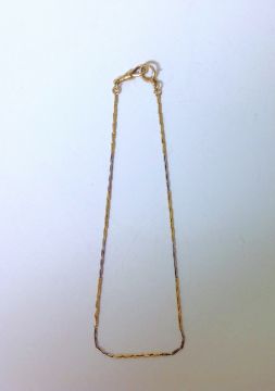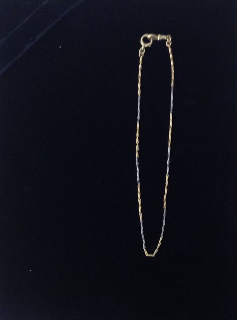 the alternating yellow and white metal sections testing for gold, the chain having clip to one end and simple hasp to the other