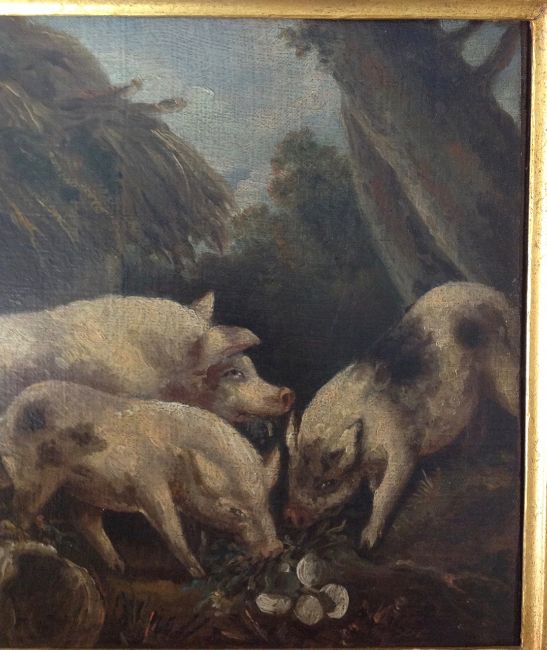 'Three pigs foraging in woodland', oil on canvas, indistinctly signed, in a gilt frame, a/f.