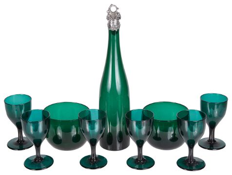the stemmed wine glasses with circular bases, the bottle with silvered metal stopper and collar decorated with vines and the two finger bowls of circular shape, (9).