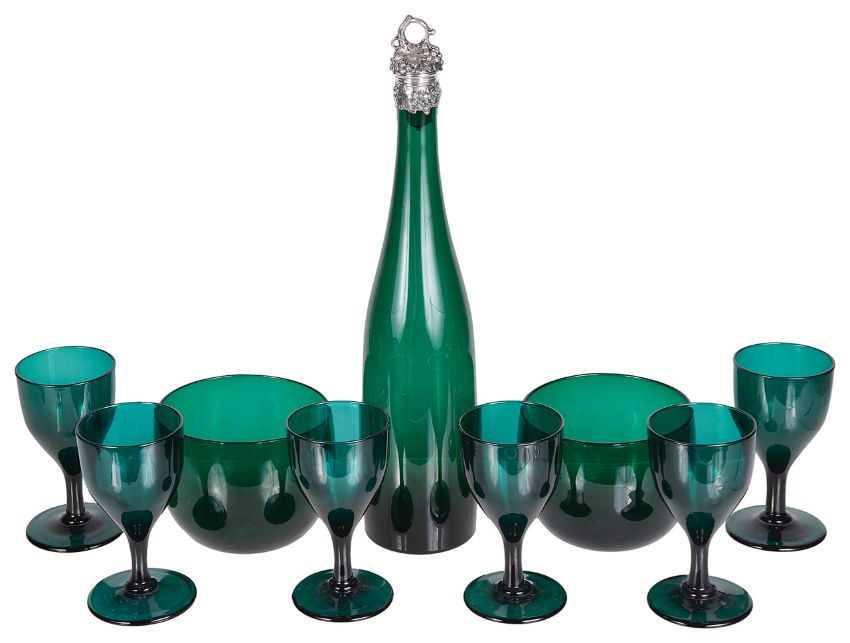 A suite of six Bristol green glass wine glasses, with two finger bowls and bottle,