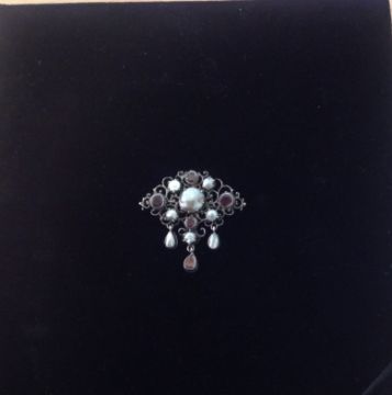 the white metal scroll brooch set with flat cut garnets and blister pearls and having two blister pearl drops and one garnet drop below, tests for silver