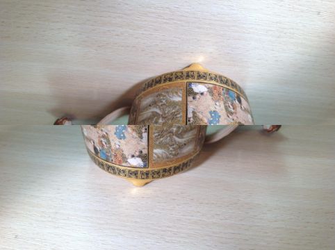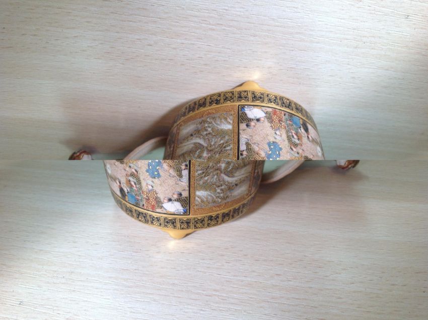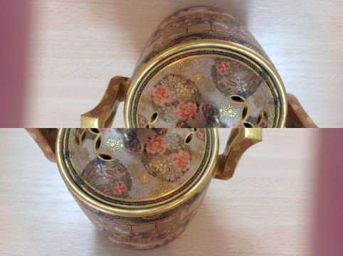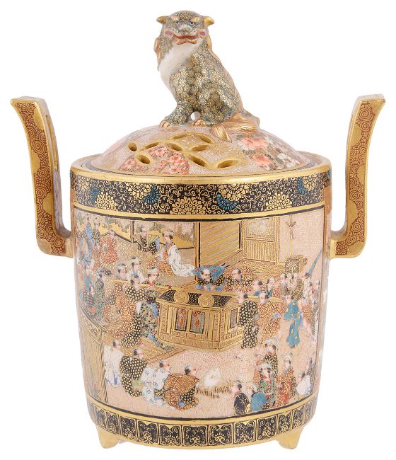 heavily embellished with gilt stylised flower patterns to the borders and handles, with two central panels both finely painted one depicting a crowded ceremonial court scene, the other depicting a crowded coastal scene, the pierced lid finely painted with chrysanthemums with finial in the form of a komainu, raised on tripod feet, with painted mark to base