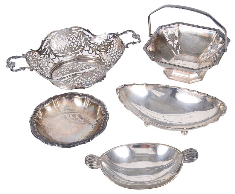 two German examples and two examples from the Netherlands, one pierced with twin handles, each with hallmarks to underside and a silver plated swing handle bon bon dish, (5).