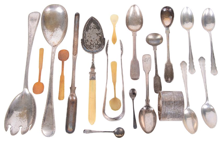 four teaspoons hallmarked Sheffield 1916 by William Hutton & Sons Ltd; a teaspoon hallmarked London 1835 by Jonathan Hayne; a teaspoon hallmarked London 1824 possibly by William Eaton; a napkin ring hallmarked London 1916 by Edward Barnard & Sons Ltd; a mustard spoon hallmarked London 1826 possibly by Thomas Daniell; two condiment spoons, marks rubbed; repaired sugar nips hallmarked Edinburgh 1827 by Patrick Sutherland; a silver plated salad fork and spoon; an ivorine handled jam spoon; a silverplated marrow scoop; a silver plated mustard spoon and four bone condiment spoons, (19).