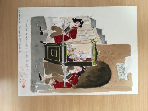 unpublished cartoon artwork for Playboy, drawn: Nov. 1981, pen and ink with watercolour, on Arne board, signed right, caption below, artists notes in margins, Copyright Playboy All Rights Reserved stamp & Playboy Publications Inc. Reproduction Prohibited Without Permission lower margin & verso, Smilby yellow dot verso, with dust sheet, together with artists rough workup for this artwork with artists notes in margins, signed lower right, ‘Ok Color – H’ in red crayon possibly by Hugh Hefner, (2).