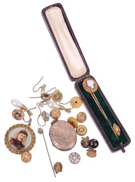 the dress studs naturalistically modelled as flies and testing silver gilt, one a.f., a cabochon sapphire and pearl cluster pin, detachable, a pair of 9ct gold faux turquoise earrings, Etruscan style shell portrait cameo stick pin, 9ct gold mounted rose diamond set stick pin, box, and various other small items (Q)