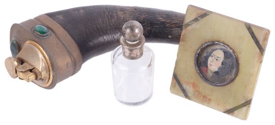 Condition: Fair, with wear to each item, damage to edge of frame and horn body, lighter not tested.